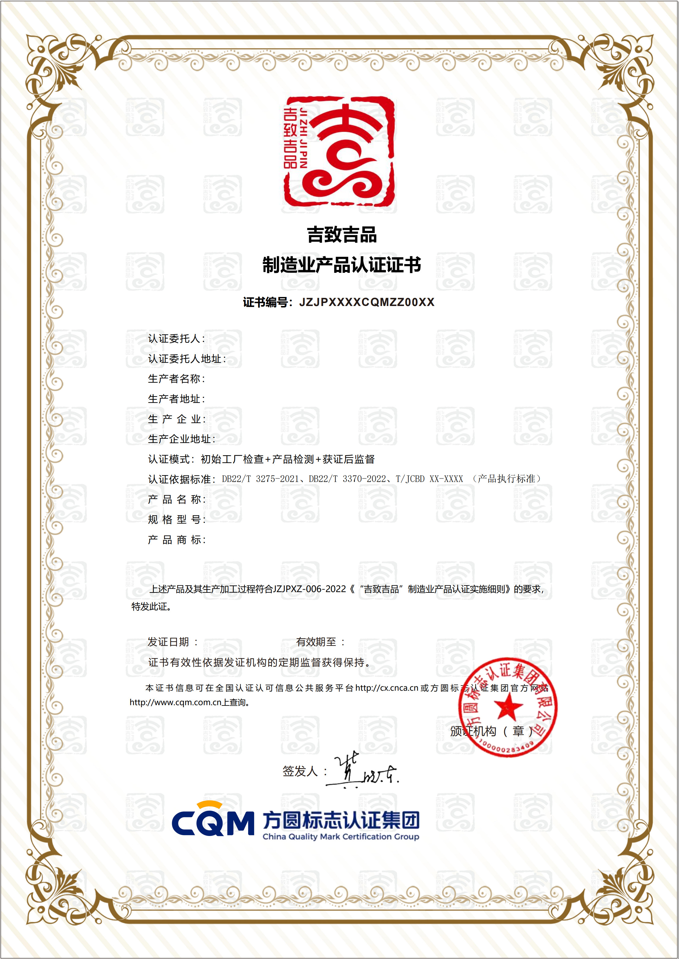 标识寓意:“吉致吉品”标识,是吉林省区域品牌认证标识,代表吉林产品和服务形象。吉致,寓意匠心之致、品质之质、智造之智、振兴之志;吉品,寓意吉祥之品、吉地之品、吉韵之品、吉尚之品。拥有“吉致吉品”,带来吉祥。